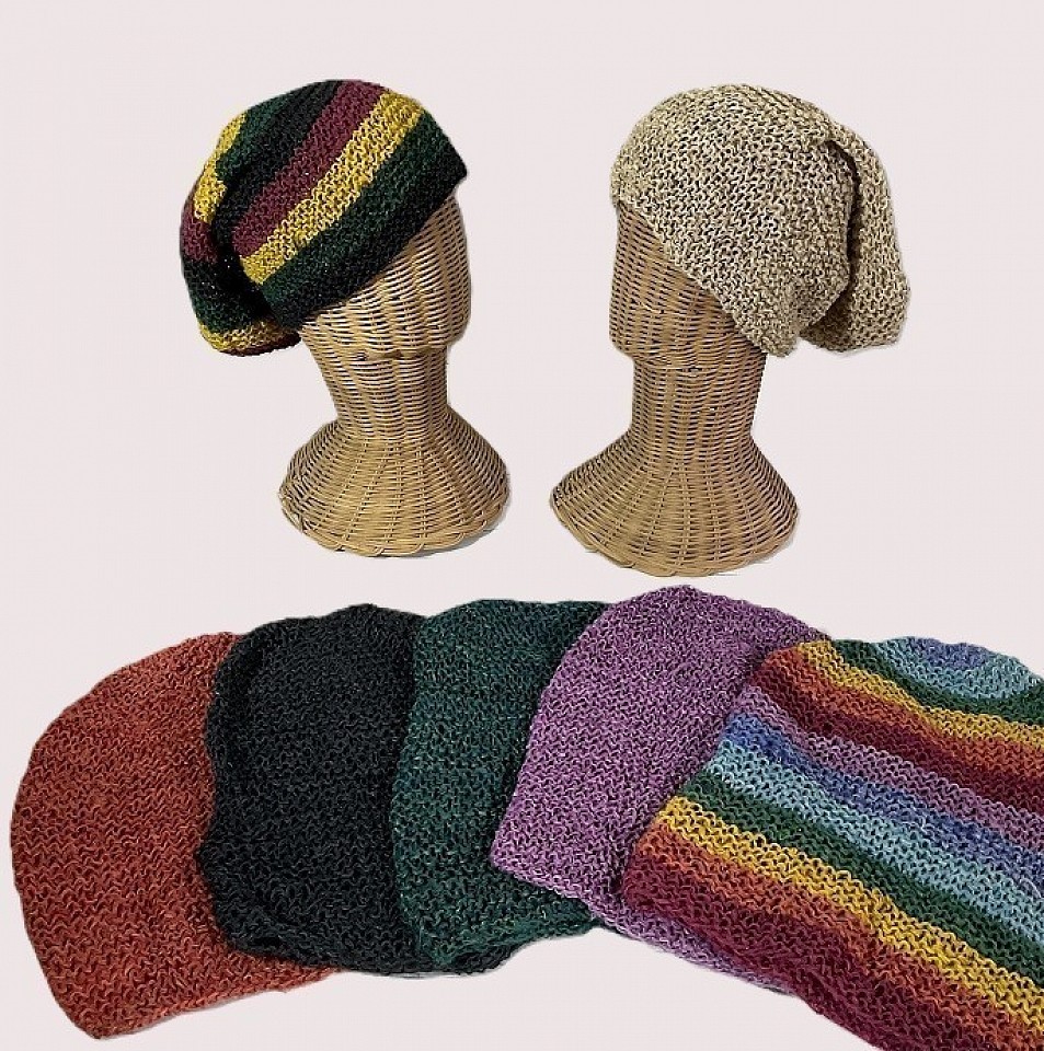 Item # NH-21 These hand crochet hats were made in Pu-sang province in Northern Thailand. The hats is a stylish and very versatile hat and can be worn quite a few different ways. Made form 2 strands of natural fiber - one strand of # 7 cotton and one strand of a hand spun Hemp. These are sold in assorted colors at a close out price of 60thb ea. LIMITED TO STOCK ON HAND. The Minimum wholesale order is 1000thb for any combination of Items in our close out sections.
