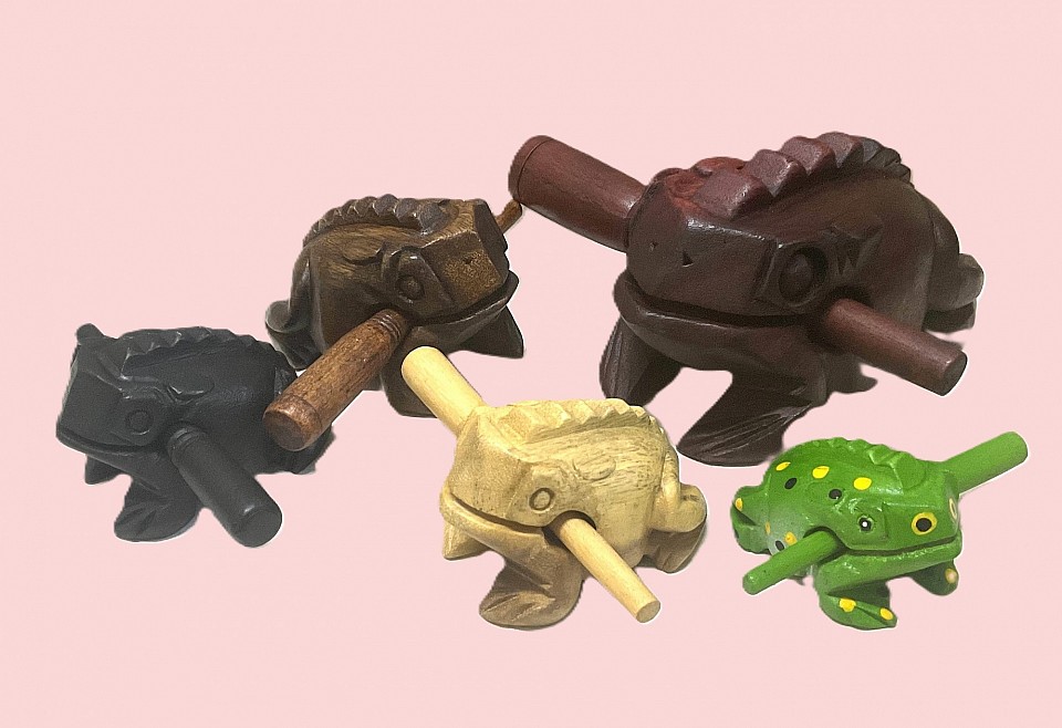 These frogs are hand made in Northern Thailand from Monkey wood ( Mai- Somcha) While this item has been on the market here in Thailand for over 20 years Its still a very strong seller. The Frogs are being sold and used world wide as both a percussion instrument and as a novelty item. The frogs are available in the following sizes 1.5'', 2'', 3'', 4'', 5', 6'', 8'' 10'' and 12''. At times the larger size frog blanks can be a bit hard for us to come by.