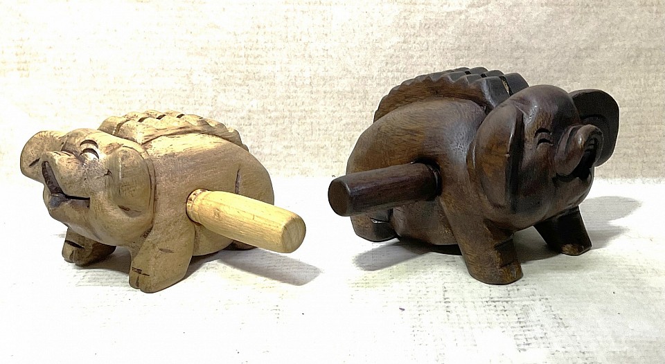These singing Pigs are made from Monkey wood ( Mai- Somcha ). They are available in 3 different sizes - SP-3'', SP-4'' and SP-5'' The singing Pigs can be finished in 4 different colors. A natural wood finish, Brown, Black and a Reddish brown